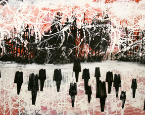 Maar op een dag, een goede dag, hakte hij bruut de knoop door en besloot hij te vluchten uit deze wereld van programmeertaal en vieze koffie. Als een wildeman begon hij om zich heen te slaan met verf en kwasten, en dat doet hij nog steeds. Een vastomlijnd plan heeft hij niet: hij laat zich inspireren door het moment en gaat vervolgens ongebreideld aan de slag.
